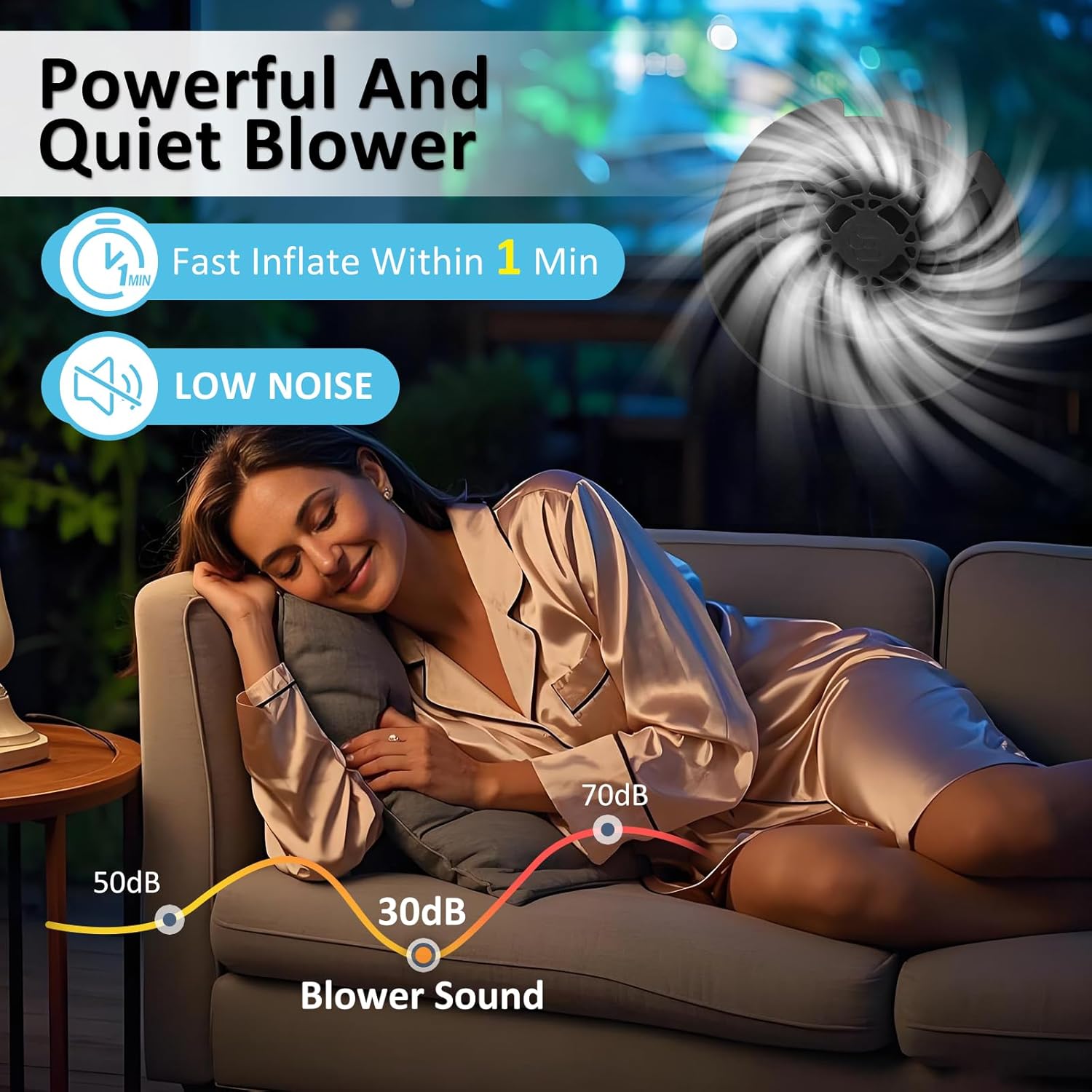 – Built-in blower inflates in about 1 minute
