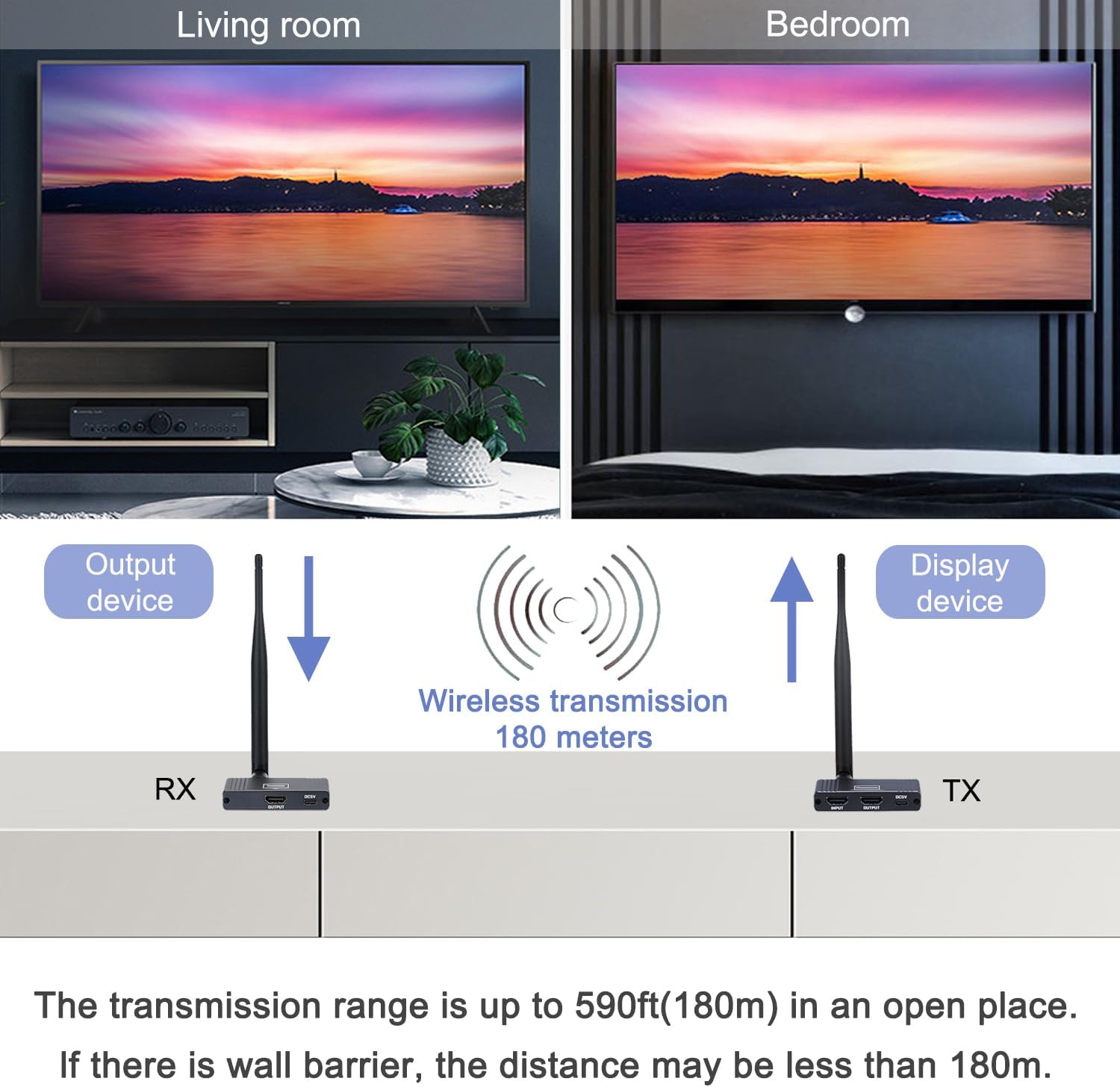 • ✅ This HDMI wireless transmitter and receiver kit supports 1 frequency for 5.8GHz, uses 5.8GHz transmission standard technology so the transmission efficiency is faster and more stable. The transmission range is up to 590ft (180m) in an open place. lf there is wall barrier, the distance may be less than 180m.
