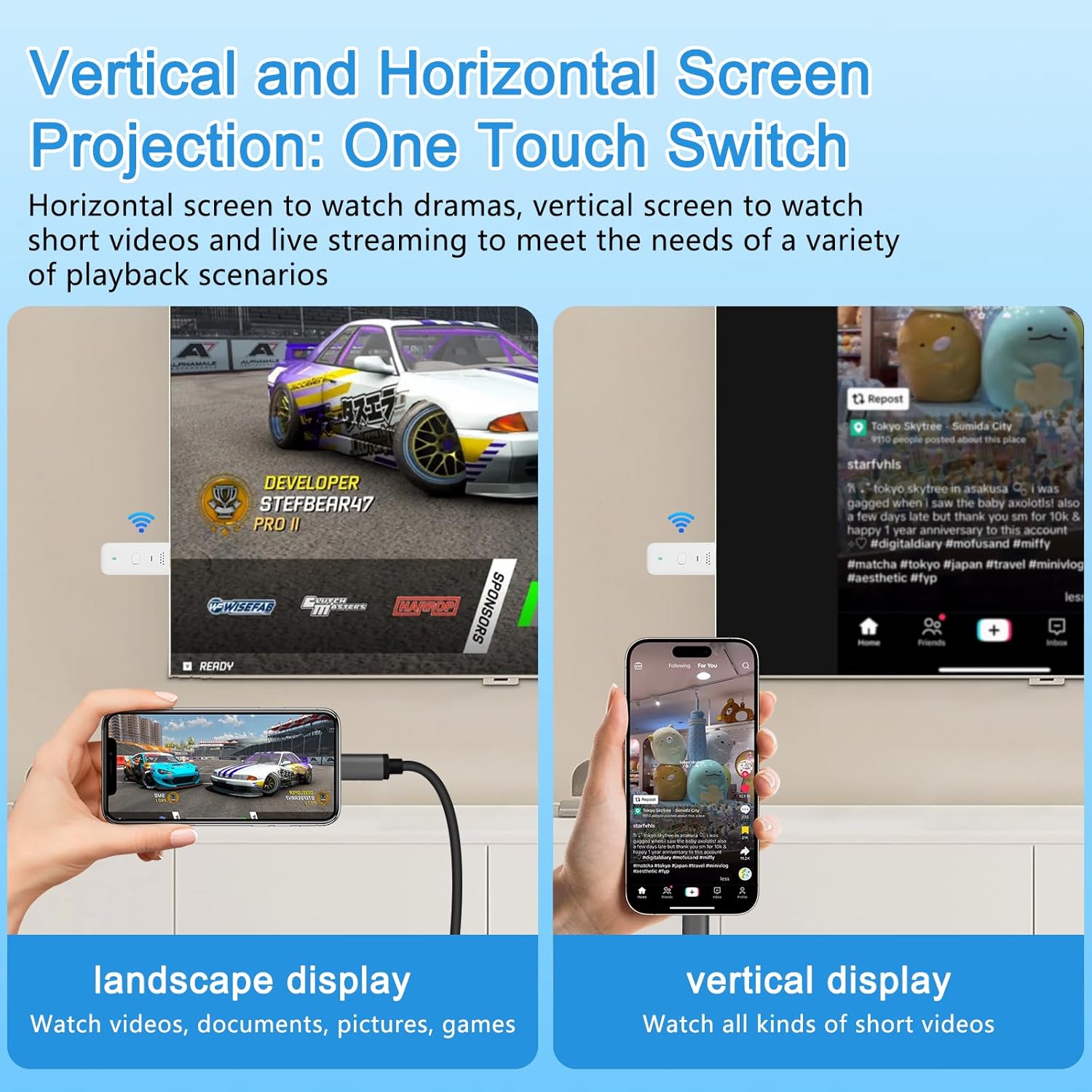 This image shows a simple way to connect your devices without needing a long HDMI cable. You get two small white devices. One plugs into your laptop, and the other plugs into a screen with an HDMI port. They work together wirelessly, so you can share what’s on your computer screen to a TV or monitor up to 100 feet away. It’s like magic, but it uses wireless signals at 5.8G or 2.4G frequencies to show clear HD 1080P video.
