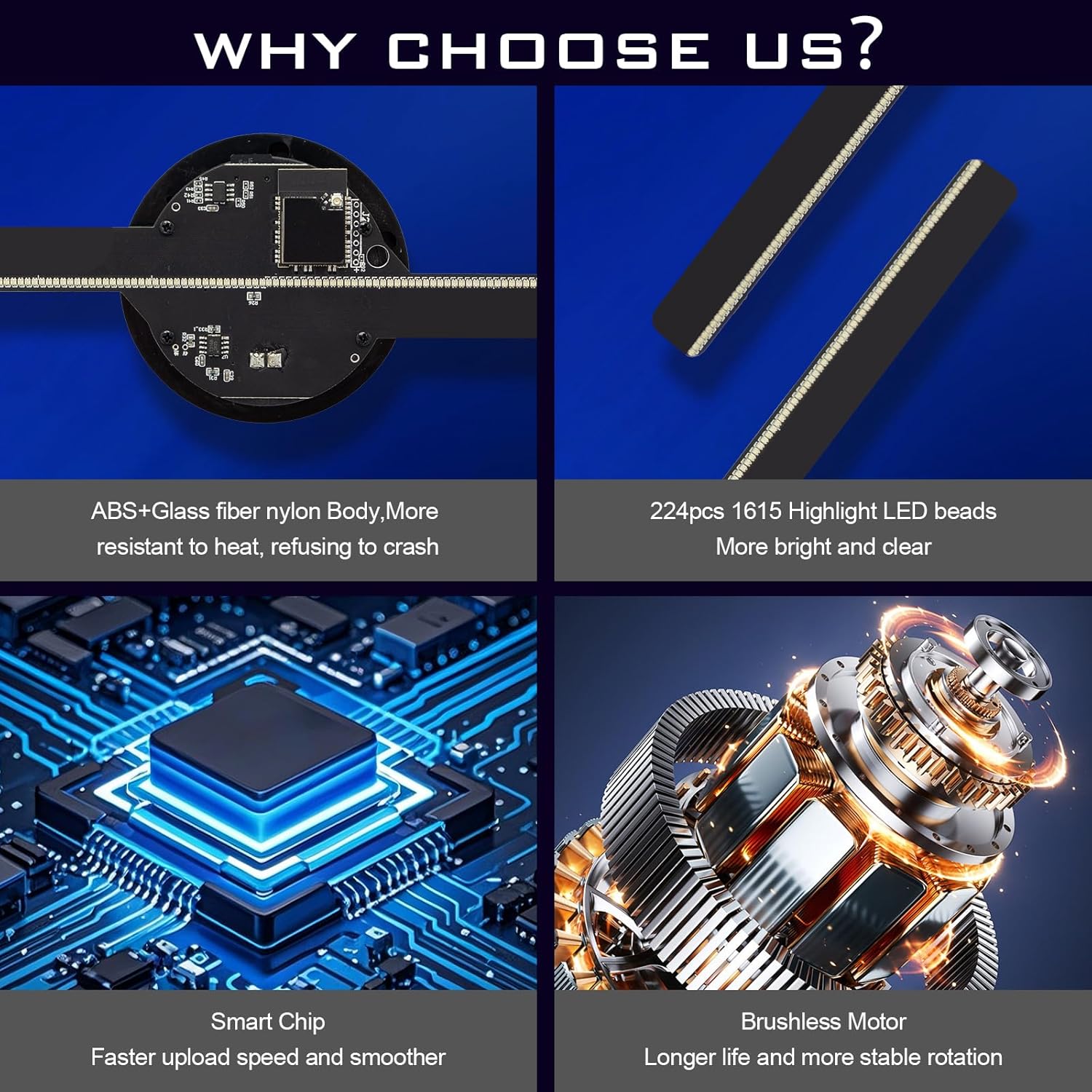 The HoloSpin 3D Hologram Fan is a 16.5-inch device that creates amazing 3D images that seem to float in the air. It has WiFi, so you can easily change what it displays, and it uses 224 bright lights to make the images very clear, even in well-lit rooms, thanks to its 2000 cd/m² brightness. It comes with over 1500 free 3D videos and pictures you can use right away, making it perfect for drawing attention to store displays, events, or exhibitions.