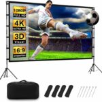 The Jiang&Rong 120-inch portable projector screen is a good choice for both indoor and outdoor viewing. It’s a reasonably priced screen that is sturdy and well-made with a metal frame. It comes with a carrying bag and is easy to put together, making it convenient for large groups. The screen is flawlessly white and wrinkle-free, perfect for 4K HD and even rear projection. While it’s very sturdy due to its thicker poles and heavy bases, some users noted a slight sag on top, and the setup can take a bit of time. The carrying bag also fits tightly, and its zipper can be a bit snug. Read more…