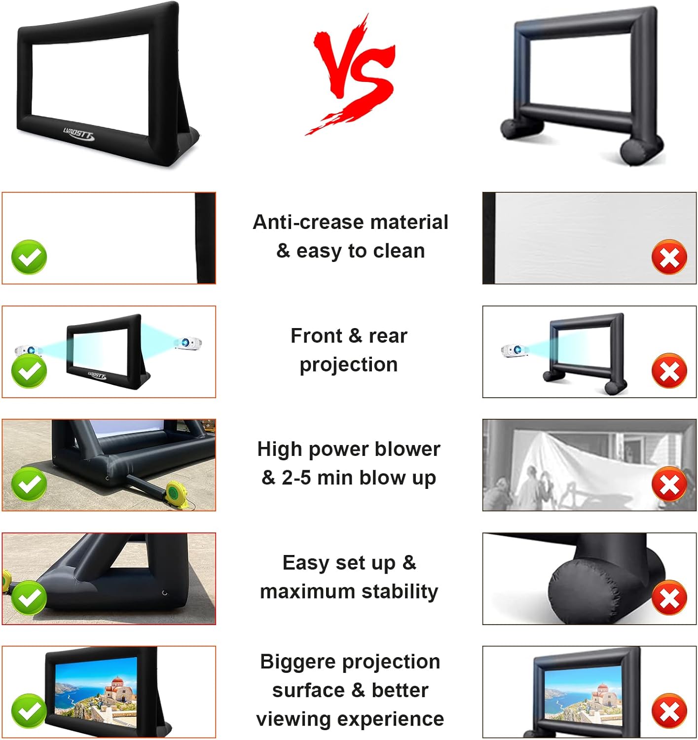 • ✅ 【INNOVATIVE DESIGN】The triangular base design keeps the inflatable projection screen stable during performances and also provides a better viewing angle, and the ground spikes and ropes included in the package for added stability provide an excellent viewing experience even on windy days. One-piece design, no need to install the screencloth. No patchwork joint, No creases! It's stable and without hassle of assembling, just connect the blower and inflate it!