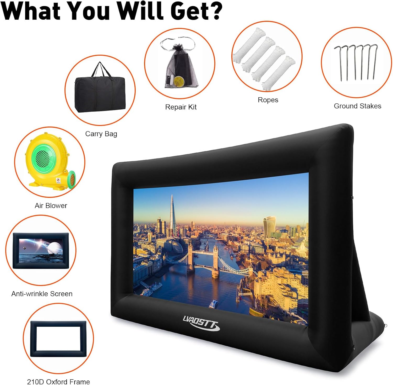 • ✅ 【HIGH QUALITY MATERIAL & EASY TO CLEAN】The inflatable movie screen is made with 210D oxford cloth and has a multiple sewing process. The white display screen is made of more delicate silk cloth. No creases are left when the screen is inflated. The black frame is made of tougher Oxford cloth, which is non-deformable and stain-resistant to ensure durability. And It is easy to clean with a cloth.