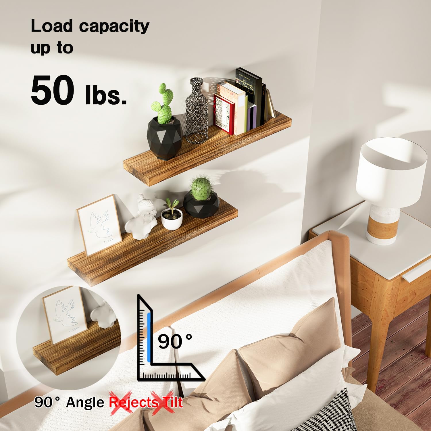 These TREEMBER floating shelves come in a pack of two and are 24 inches long. They offer a rustic look with an option for a natural burned finish, and they’re also available in white. The shelves have hidden brackets, making them look like they’re floating on the wall. Each shelf can hold up to 50 pounds, making them great for bedrooms, living rooms, kitchens, or bathrooms.