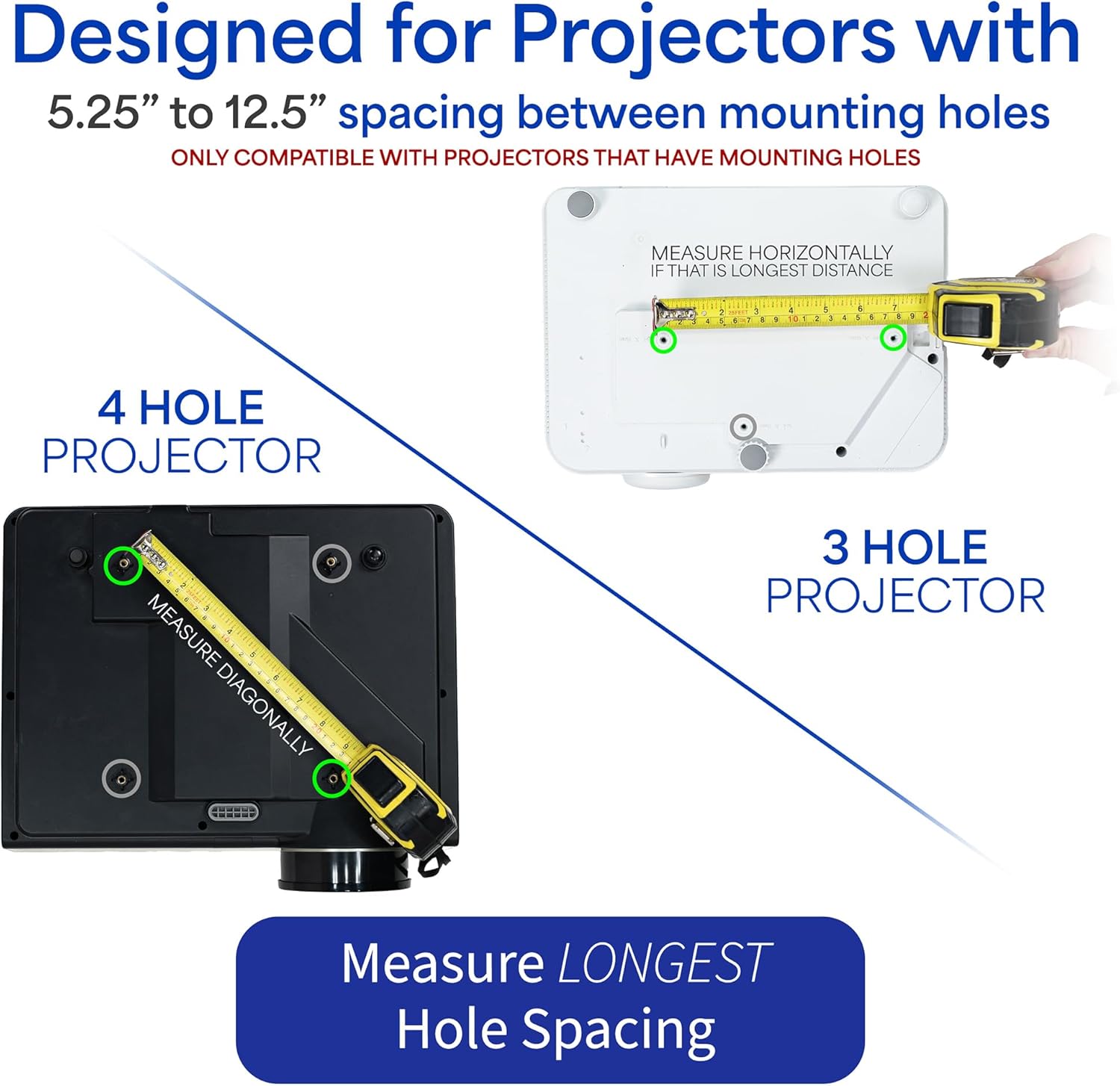 • ✅ Universal Design: Adjustable mounting points enable this bracket to fit the majority of projectors on the market with mounting hole diagonals measuring up to 12.5”. If your projector has 3 mounting holes, simply remove one of the arms to fit your display