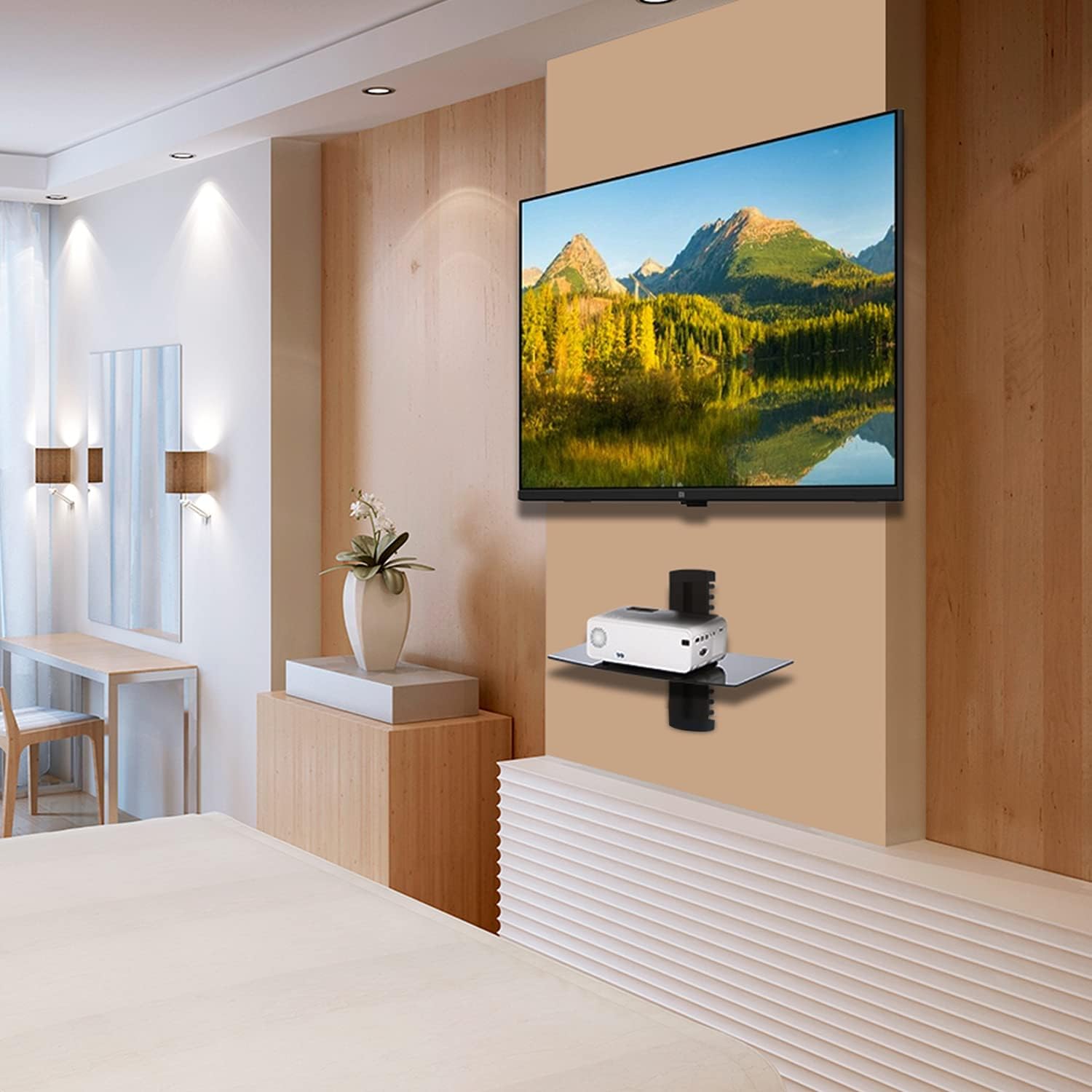 The WALI CS201B is a black, floating entertainment shelf that helps you organize your TV area. It has a strong, tempered glass shelf that can hold up to 17.6 pounds. This shelf is perfect for things like DVD players, cable boxes, game consoles, and other TV accessories, keeping them neatly off the floor.